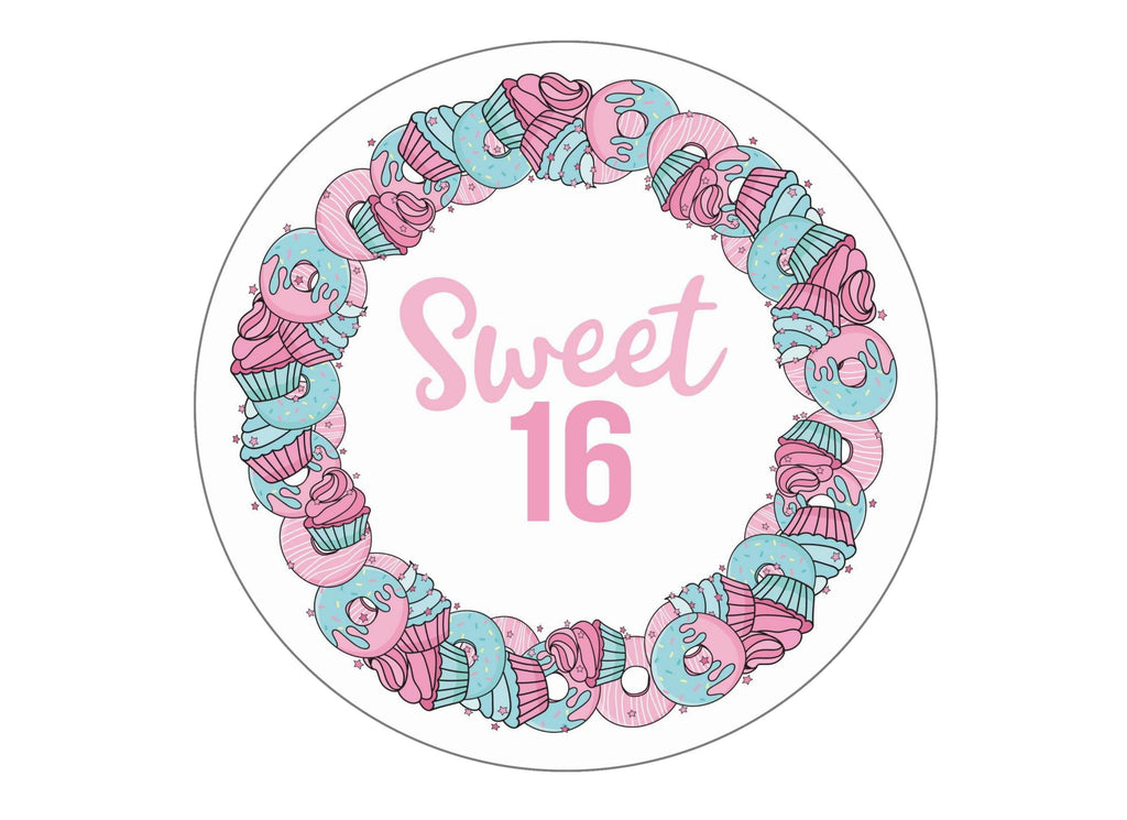 A range of pre-designed edible toppers perfect for a sweet sixteenth birthday party, with cute images of doughnuts and cupcakes in shades of pink and blue. These are printed in a range of sizes, available in a choice of three paper types. All products are 100% edible and easy to use.